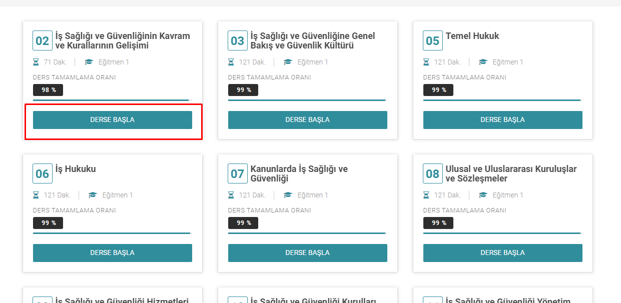 - Dersi başlatmak için resimdeki gibi dersi "DERSE BAŞLA" butonuna tıklayınız . Dersin ne kadarlık kısmını bitirdiğinizde hemen butonun üzerinde gözükmektedir .