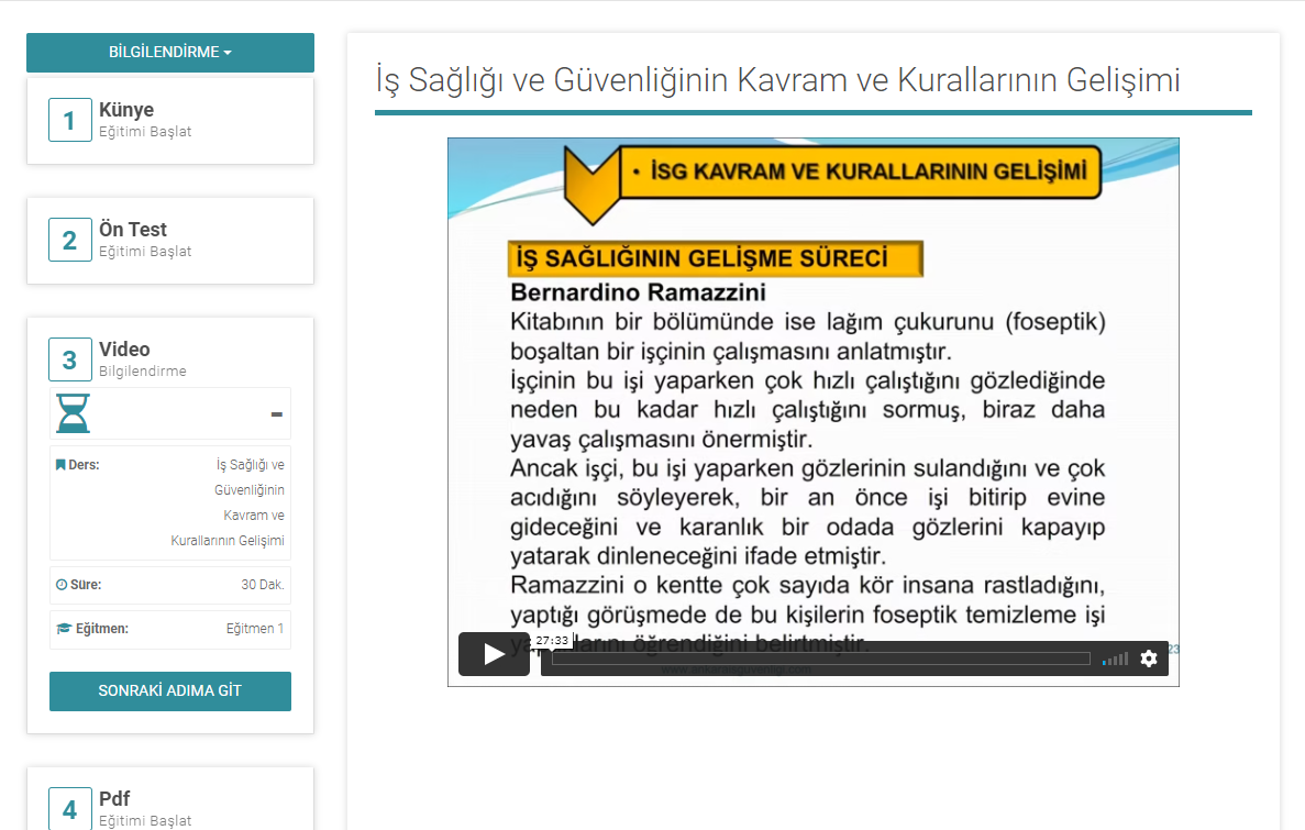 Görsel eğitime giriş için ön testi bitirince sonraki adıma ve ya direk 3. adım olan video başlığına tıklayabilirsiniz.