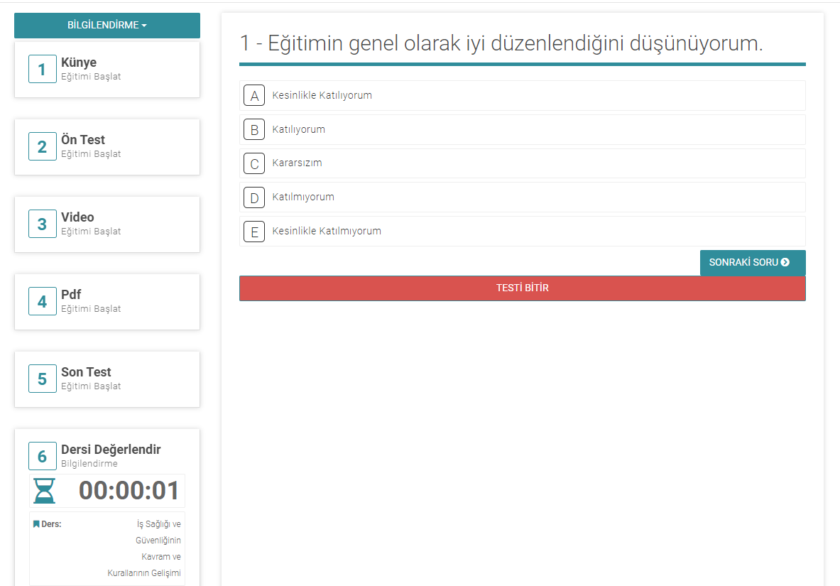 - Dersi değerlendirmek için lütfen aşağıdaki resimde görüldüğü gibi soruları yanıtlayarak testi bitir butonuna basarak dersi değerlendirebilirsiniz.